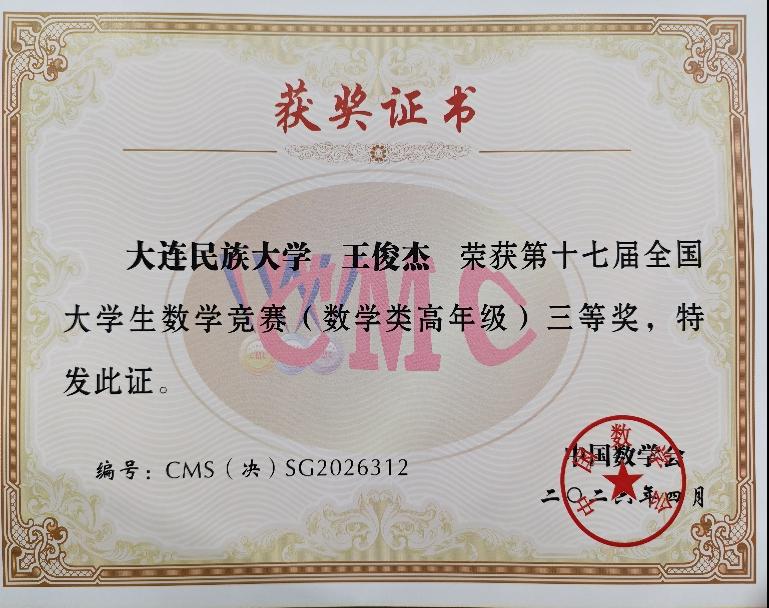 第十七届全国大学生数学竞赛决赛于4月17日至19日在四川大学、成都理工大学举行。本届赛事共有32个赛区35.2万余名本科生报名参加初赛,经层层选拔,全国379所高校的1366名学子最终进入决赛。我院23级数学与应用数学专业王俊杰同学经过初赛和选拔赛,以优异的成绩代表赛区参加数学类高年级(辽宁赛区共13人)全国总决赛,并获得全国总决赛三等奖,也是我校数学类专业学生首次进入专业组全国总决赛。